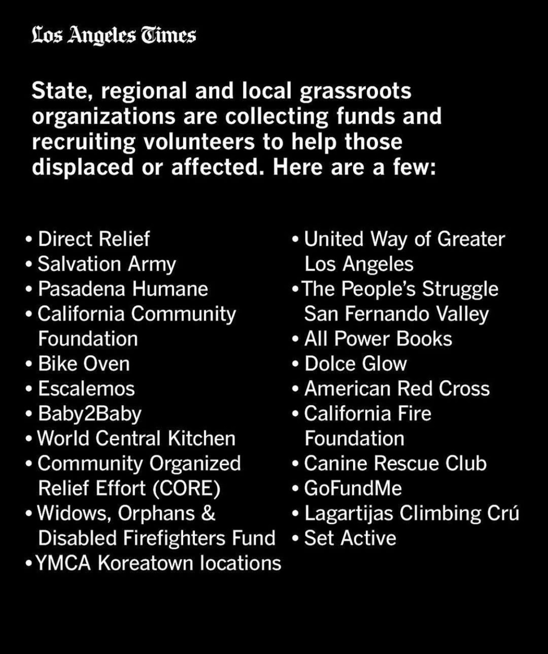 - 캘리포니아 커뮤니티 재단 (California Community Foundation) : 비영리 단체에 자금을 지원하여 복구 작업과 장기적인 재건을 돕습니다.